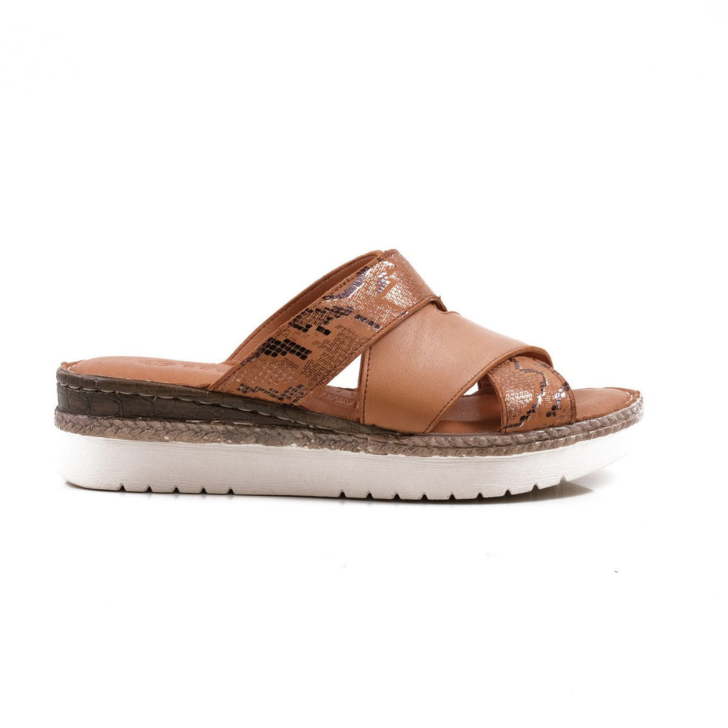 A densely padded leather slide with a unique cross-over design, incorporating a touch of snake-print! On a soft and padded leather footbed, for breathability on even the hottest days. Absolute comfort, handmade in Europe.